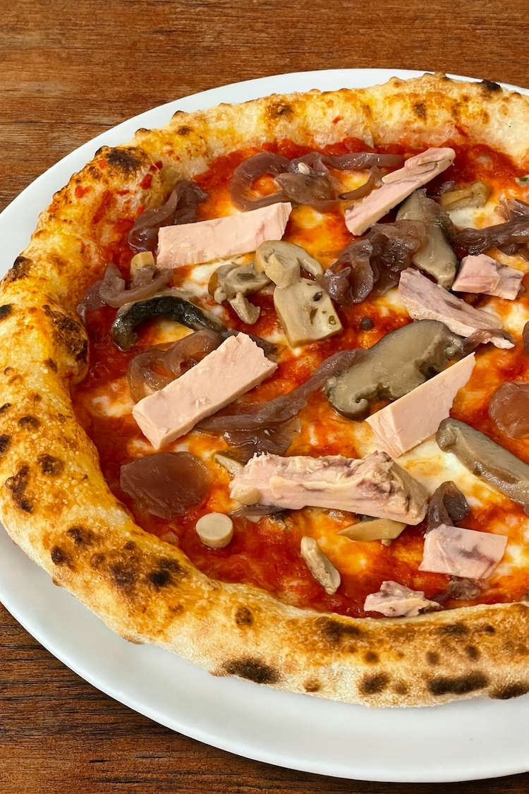 Con polpa di pomodoro pugliese passato a mano, fiordilatte di Seriate, funghi misti, cipolla caramellata e il protagonista: il trancio di tonno selezionato Callipo, con stagionatura di 12 mesi.