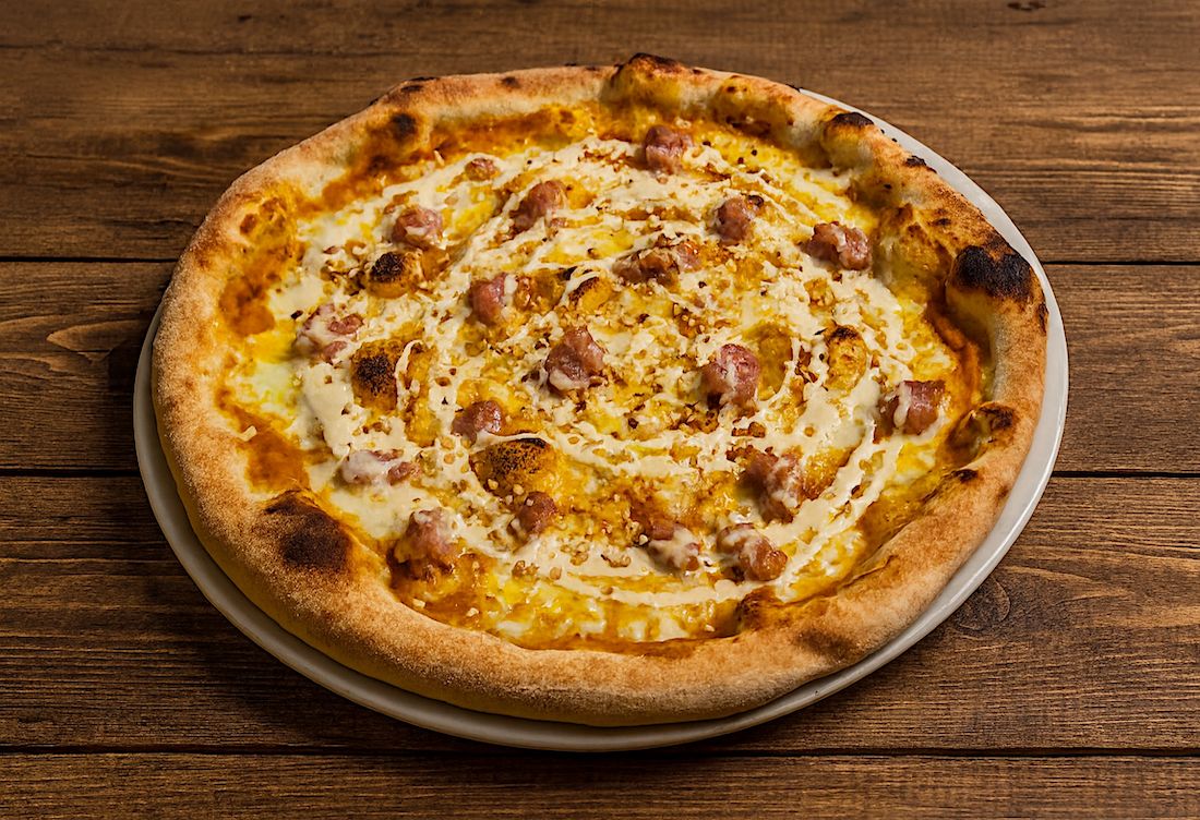 Con polpa di zucca a filiera corta, fiordilatte di Seriate, salsiccia fresca veneta, crema di pregiato formaggio piemontese Castelmagno e granella di nocciola.